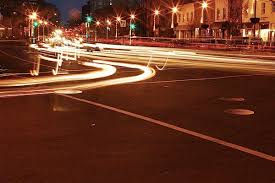 In this picture you see a street in the night and the car lights are blurred motion.